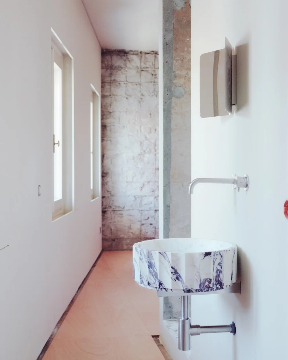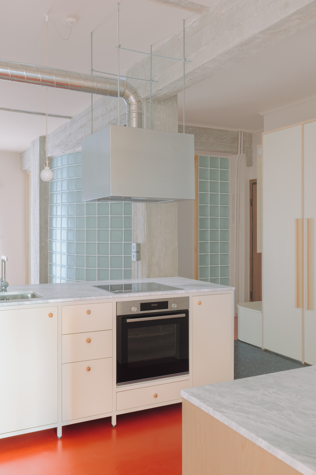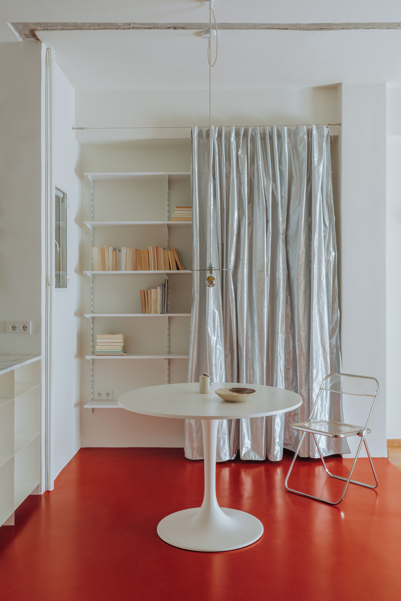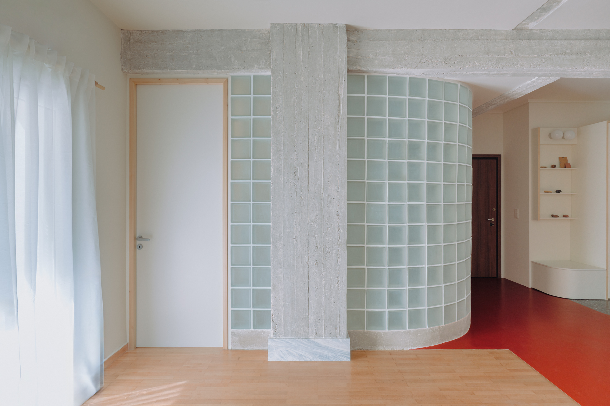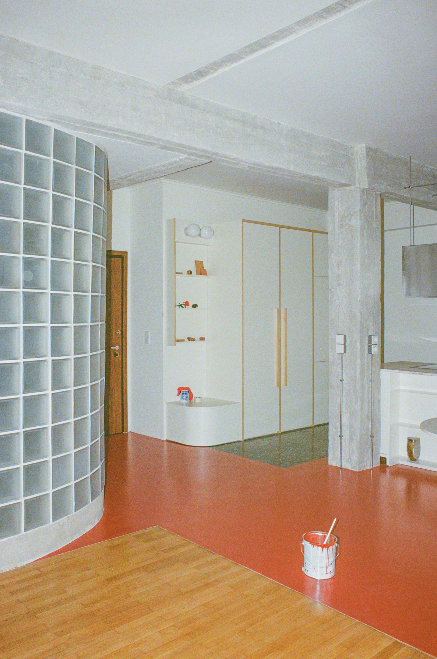 Πραγματοποιώντας ένα ‘αρχιτεκτονικό μπρικολάζ’, οι threshold συνδυάζουν νέα και παλιά, ετερόκλητα και αναπάντεχα σχεδιαστικά στοιχεία: τα αυθεντικά ξύλινα δάπεδα και το μαύρο μωσαϊκό του διαμερίσματος συναντούν ένα αποκαλυπτικό κόκκινο πάτωμα, μια σκηνογραφική ασημένια κουρτίνα, μια κουζίνα με χαρακτήρα και, τα δειλινά, ένα φωτεινό γυάλινο κουτί.