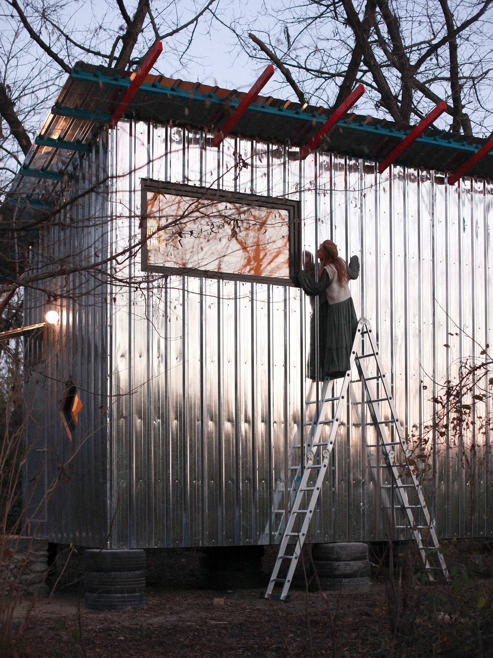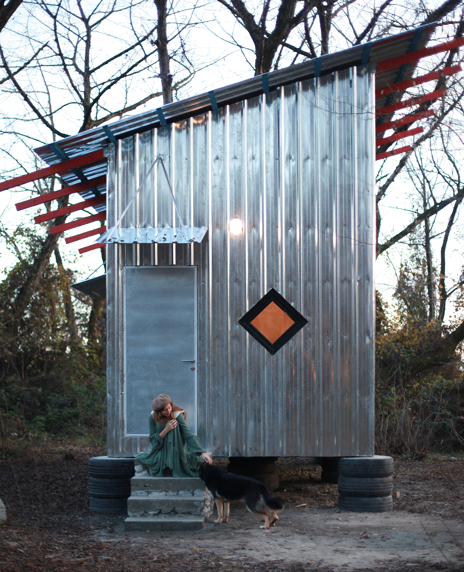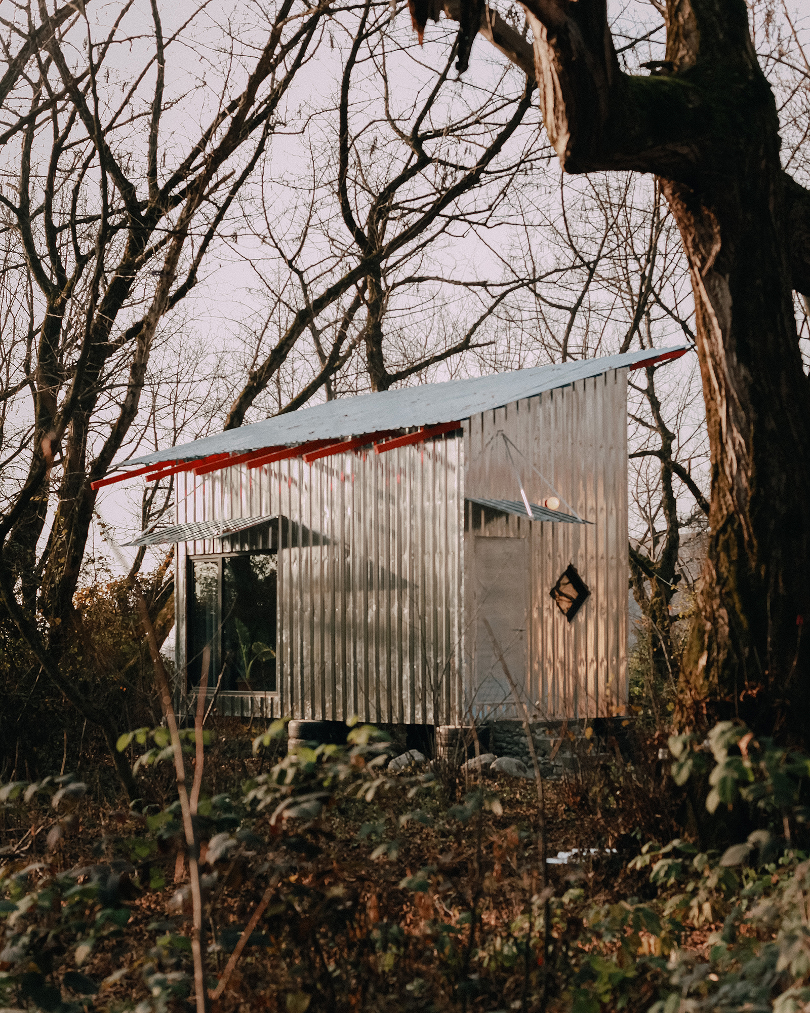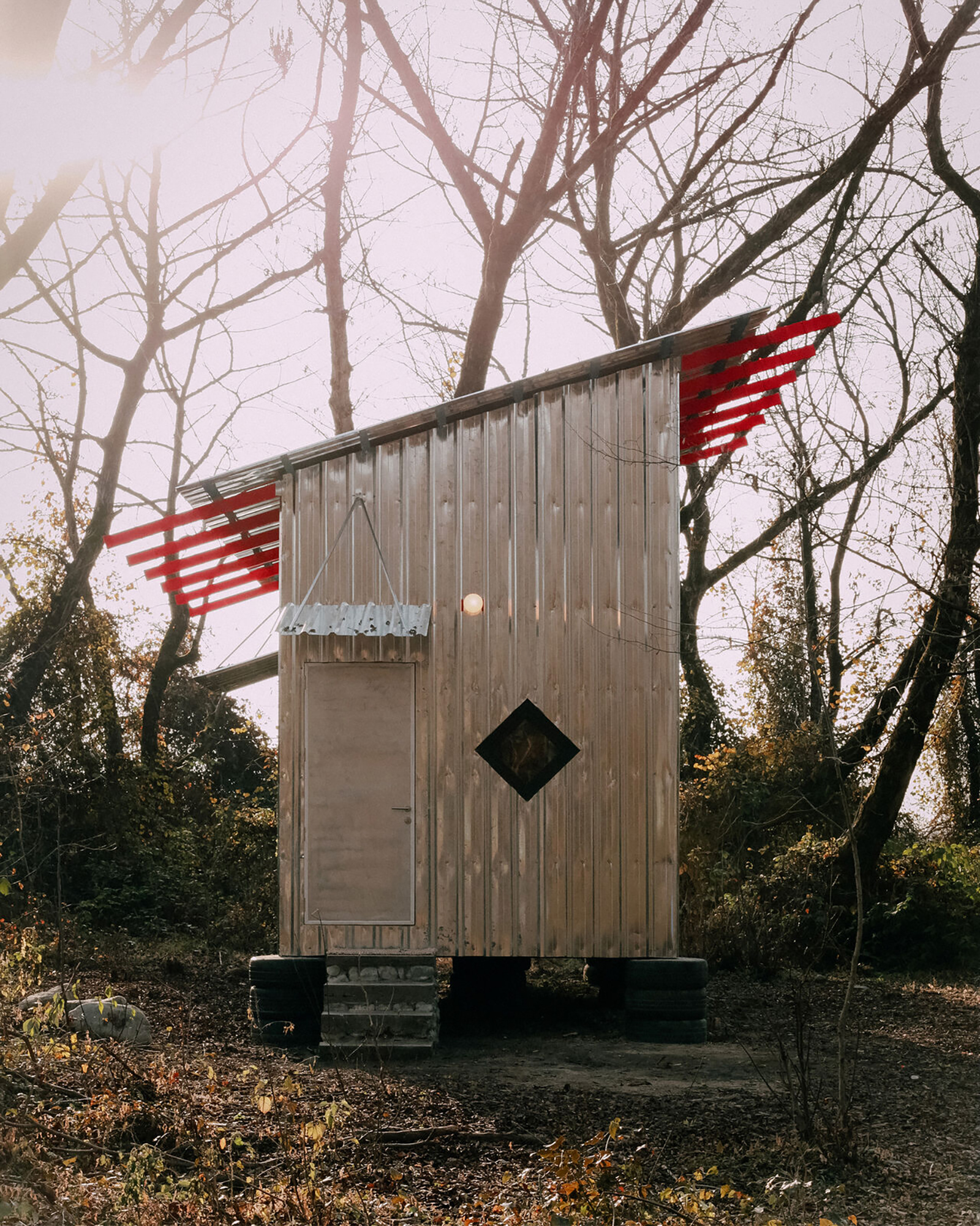 Built from locally sourced and repurposed materials, the self-contained structure combines simplicity with ingenuity. A timber frame, reused tires, and a corrugated metal skin create a lightweight yet stable system. Experimental yet grounded, it offers a sustainable and flexible refuge for wanderers and dreamers.
